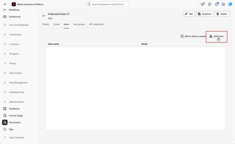 您可以通过分配所需的权限来管理访问权限,以访问联合受众组合的不同方面。 这些权限通过角色分配给需要访问 联合受众合成 的用户。