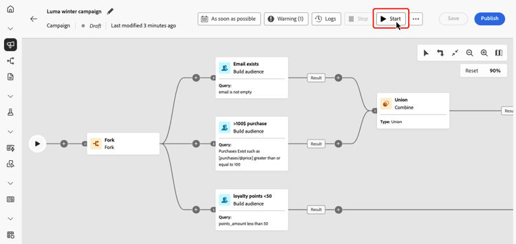 如果不想在营销活动激活后立即执行营销活动,则可以在 营销活动开始 部分中指定发送消息的日期和时间。