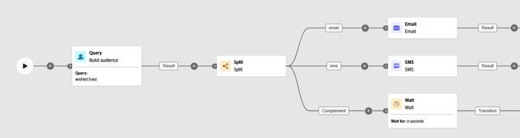 在下面的示例中,拆分 活动用于根据要使用的通信渠道将受众划分为不同的子集: