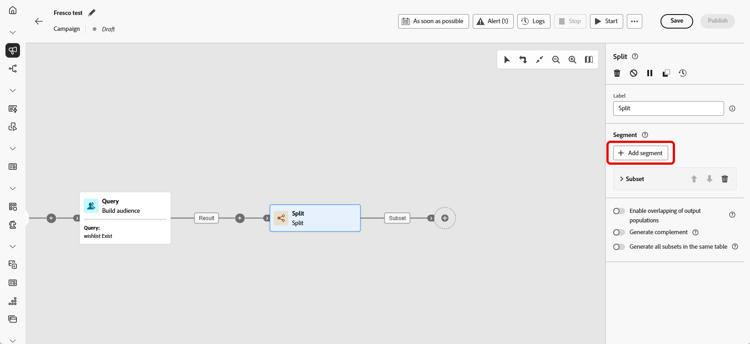 活动配置窗格随即打开,其中包含默认子集。单击 添加区段 按钮以添加所需数量的子集,对传入群体进行分段。