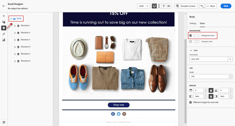 为整个电子邮件设置 背景颜色。请务必在可从左侧调色板访问的导航树中选择正文设置。