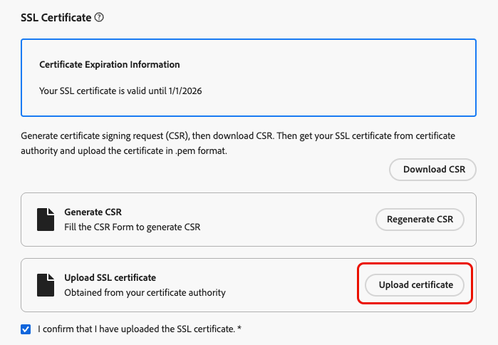 在 SSL证书 部分中,您需要将新的SSL证书上载到Journey Optimizer。