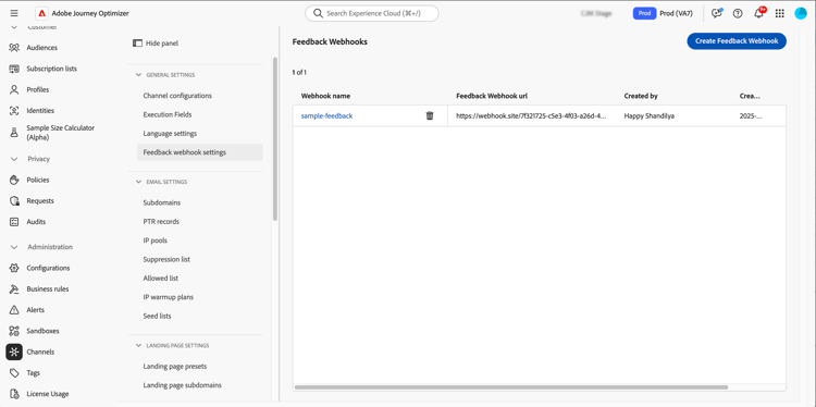 您可以从 管理 / 渠道 / 反馈webhook设置 菜单管理webhook配置。