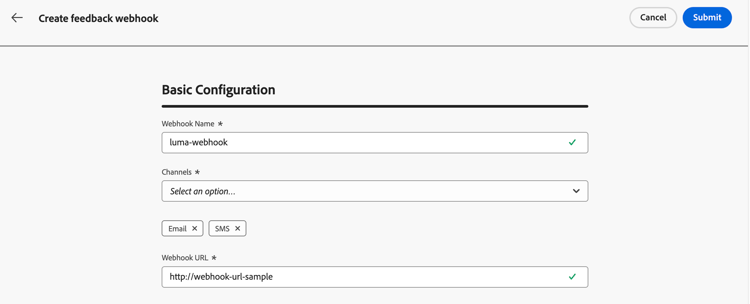 - 渠道 — 选择此webhook应接收其反馈(电子邮件和/或短信)的渠道。