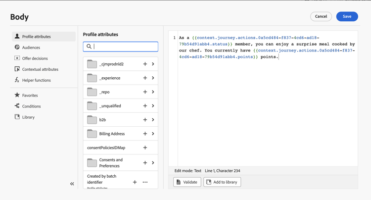然后,添加推送,并使用响应字段个性化消息。 在本例中,我们使用忠诚度积分数和客户状态来个性化内容。 操作响应字段在上下文属性 > Journey Orchestration > 操作下可用。