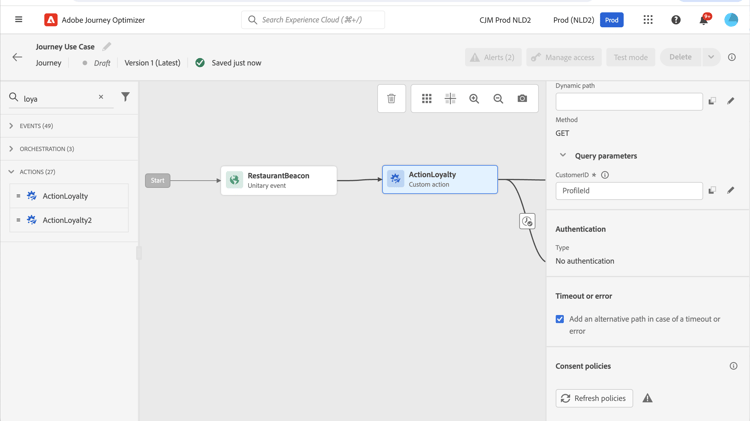 在“忠诚度”自定义操作中,将客户ID查询参数映射到配置文件ID。 选中选项在超时或错误的情况下添加替代路径。