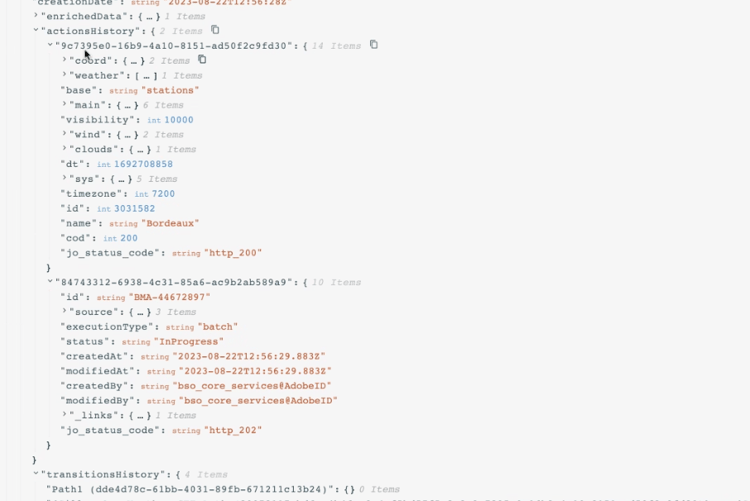 您可以通过测试模式访问与自定义操作响应相关的状态日志。 如果您在历程中定义了具有响应的自定义操作,您将在这些日志中看到 actionsHistory 部分,其中显示外部端点返回的有效负载(作为来自该自定义操作的响应)。 定义错误响应有效负载后,它将包含在失败的调用中。 这在调试方面可能非常有用。