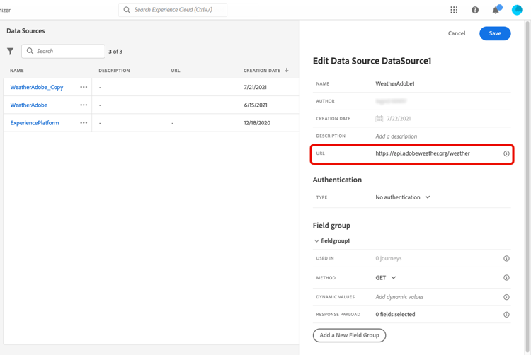 添加外部服务的 URL。在我们的示例中:https://api.adobeweather.org/weather。