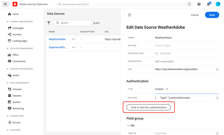 保存更改后,数据源即配置完毕,可随时用于您的历程,例如在您的条件下或个性化电子邮件时。 如果温度高于 30°C,您可以决定发送特定通信。