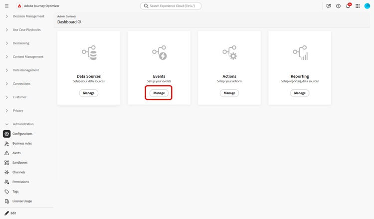在“管理”菜单部分中浏览到配置,在 事件 部分中单击管理。 将显示事件列表。