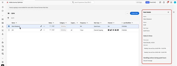 - 传播延迟 — 对静默小时规则的更新可能需要长达12小时才能应用于已使用该规则的渠道操作。