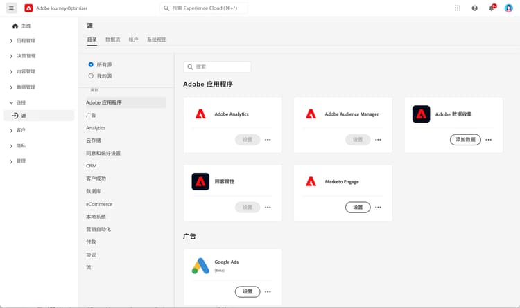 源是将外部数据接入 Adobe Journey Optimizer 的连接器。通过源,您可以从现有系统(如 CRM 平台、云存储或数据库)导入客户信息,并将这些数据用于创建个性化的客户历程。