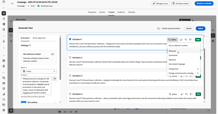 Journey Optimizer中的AI Assistant可以通过建议更可能引起受众共鸣的其他内容来帮助您优化投放的影响。