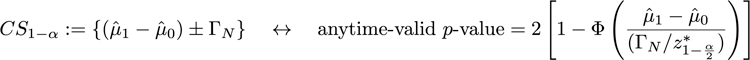 其中Φ是标准常数的累积分布。 对于随时有效的p值,给定上面定义的平均处理效果的置信序列,我们可以反转此关系: