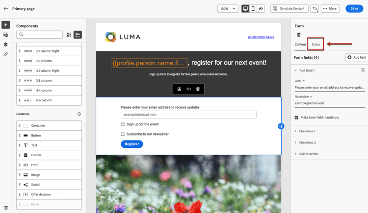 若要设计特定内容以允许用户选择和提交其选择,请使用表单组件并定义其登陆页面特定的样式。