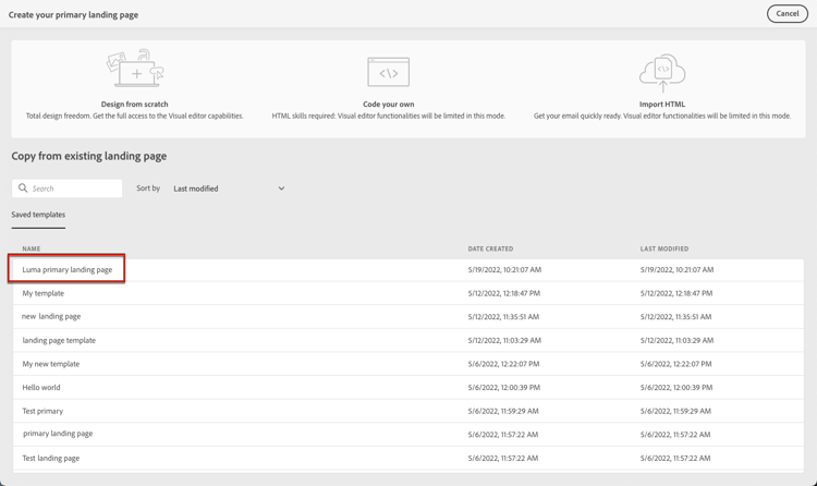 打开登陆页面内容设计器。 此时将显示所有以前保存的模板列表。