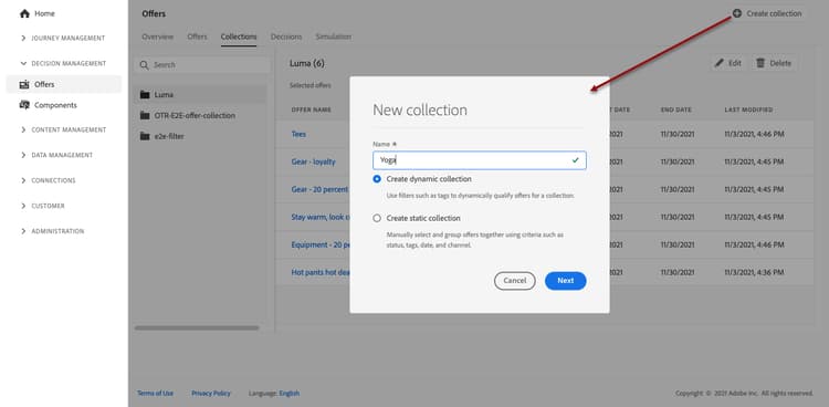 动态集合是基于集合限定符(以前称为“标记”)的优惠集合。 这些集合会自动更新。例如,如果使用选定的收藏集限定符创建新选件,则会自动将其添加到收藏集。