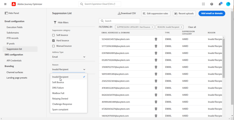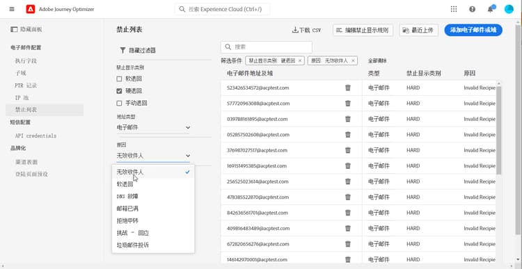 - 禁止列表包含要从投放中排除的电子邮件地址,因为发送给这些联系人可能会损害您的发送信誉和投放率。您可以监测在历程中自动排除发送的所有电子邮件地址,例如无效地址、始终软退信的地址、可能对您的电子邮件信誉造成不利影响的地址,以及针对您的某封电子邮件发出某种垃圾邮件投诉的收件人。了解如何管理禁止列表和重试。