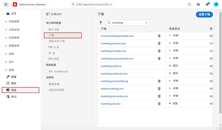 委派子域:对于要在 Journey Optimizer 中使用的任何新子域,第一步是进行委派。了解详情