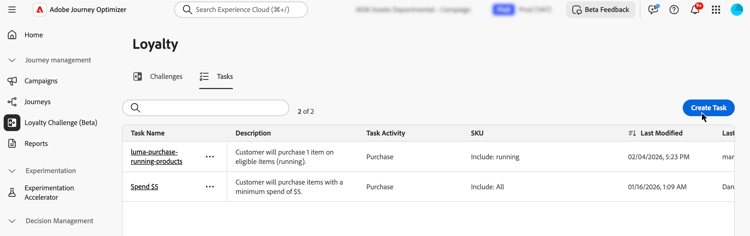 任务定义客户在忠诚度挑战中必须完成的特定操作或里程碑以获取奖励。 您可以配置任务类型、数量和产品要求,以创建吸引人的个性化忠诚度体验。