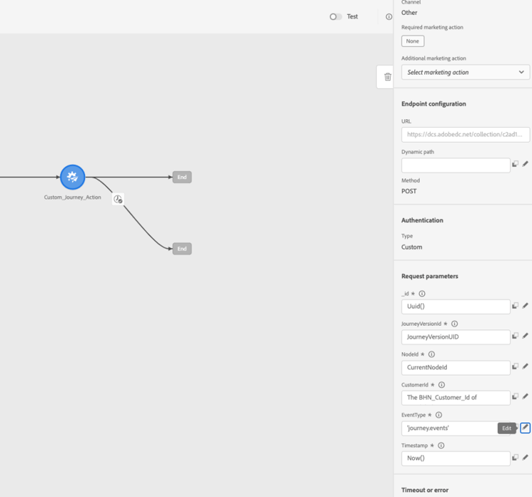 此用例说明了如何使用自定义操作和经过身份验证的调用,从历程将自定义事件写入Adobe Experience Platform。