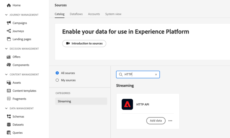 在Adobe Experience Platform中,单击左侧菜单中的 连接 下的源。 在 HTTP API 下,单击添加数据。