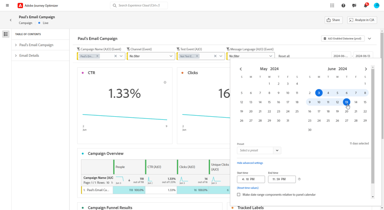 默认情况下,营销活动或历程的过滤期限设置为其开始和结束日期。 如果没有结束日期,则过滤器将默认为当前日期。