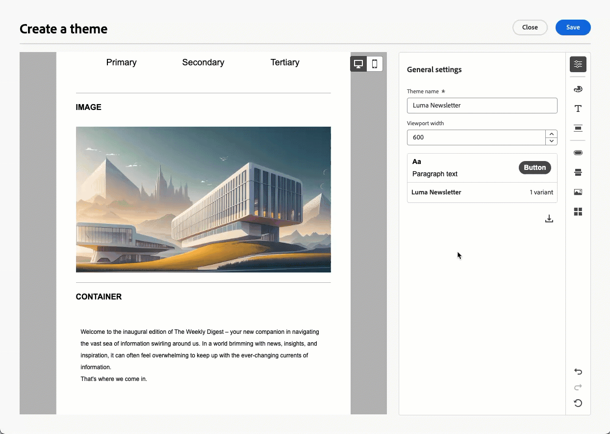 您现在可以快速应用预批准的主题,以确保在所有电子邮件中实现品牌一致性、加快营销活动创建流程,并独立生成高质量电子邮件,同时减少对设计团队的依赖。