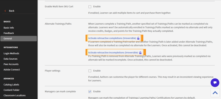 - 导航至 配置 部分> 设置 > 基础部分> 常规 > 备选课程/路径部分。