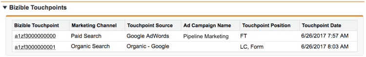 由要跟踪的内容捕获的接触点将写入安装Bizible Salesforce包创建的自定义对象。