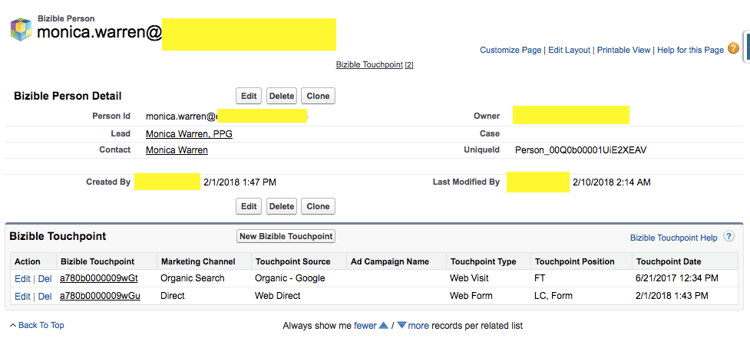Marketo Measure人员对象将潜在客户和联系人对象关联在一起。 开箱即用的Salesforce不提供在同一报表中使用商机和联系人对象创建报表的选项。 通过关联潜在客户和联系人对象,Marketo Measure人员允许您在同一报表中报告这两个对象。 当Lead已转换为Contact时,这尤其有用。 在Marketo Measure人员记录中,您将看到对应潜在客户和/或联系人记录的查找、与人员关联的接触点的相关列表以及人员ID(始终是潜在客户/联系人的电子邮件地址)。 由于Marketo Measure人员与潜在客户和联系人对象相关,因此将永远不会有与Buyer Attribution Touchpoint关联的Marketo Measure人员记录。 以下是Salesforce中Marketo Measure人员记录的示例:
