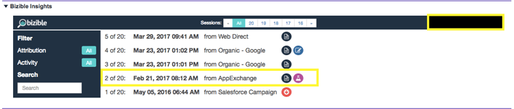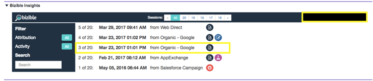 您首先看到的是FT或LC图标。 这些表示所列会话的接触点位置。 具体来说,FT代表First Touch,LC代表Lead Creation。 您可以有多个会话,但只有一个接触点可以是FT或LC。 您永远不会找到与一个人相关联的多个FT或LC。