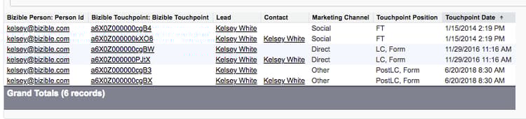 对于kelsey@adobe.com的Marketo Measure人员ID,您可以看到存在使用该电子邮件地址的销售线索和联系人。 在此报表中,报告了2次首次接触、2次商机创建接触和2次PostLC交互。 这些重复记录共享接触点日期和接触点信息,这可能会导致以下结论:尽管他们是同一个人,但他们是两个不同的人。