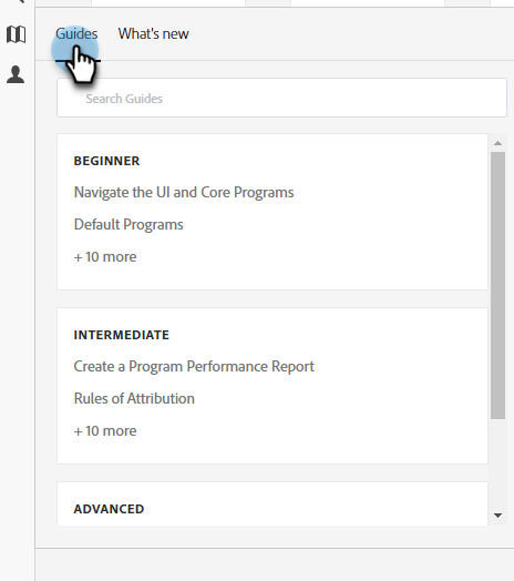指南中心包含两个选项卡:“指南”和“新增功能”。指南可为 Marketo Engage 的热门功能提供快速演练。点击所需指南,或搜索特定指南。