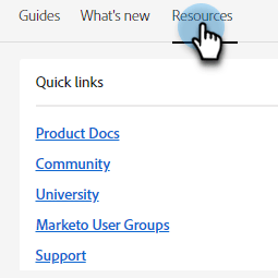 “资源”选项卡为您提供快速直接的入口,以获取 Marketo Engage 实例的更多帮助方式。
