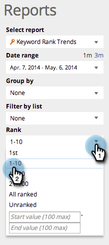 单击排名下拉列表以选择要查看关键字的排名范围。