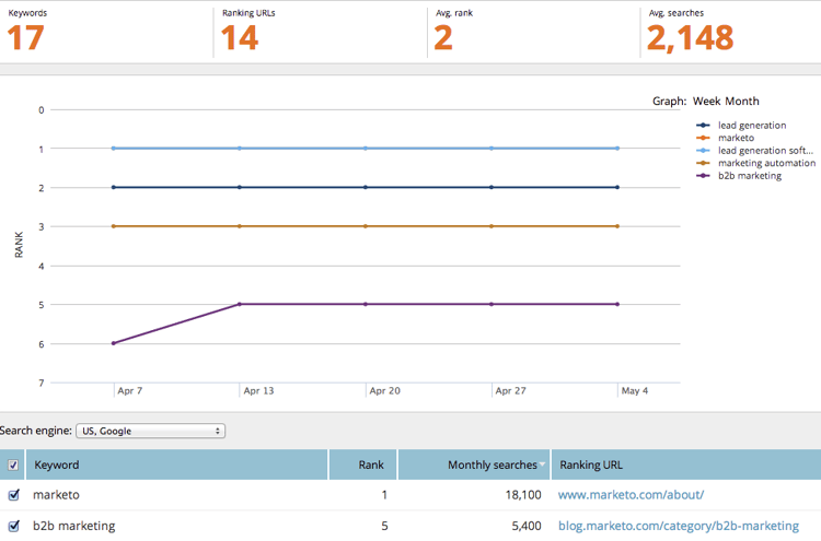table 0-row-2 1-row-2 2-row-2 3-row-2 4-row-2 项目 描述 Keywords 您正在跟踪的关键字数。 Ranking URLs 网站排名在您设置的范围中的URL数。 Avg. rank 在设置的范围中关键字的平均排名。 Avg. searches 在Google US搜索中,在您设置的范围(过去30天)内对这些关键字发生的平均搜索次数