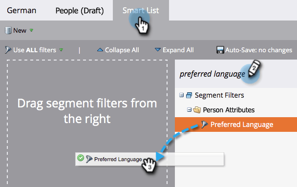 转到 Smart List 选项卡。 在搜索字段中输入 Preferred Language。 将过滤器拖放到画布上。