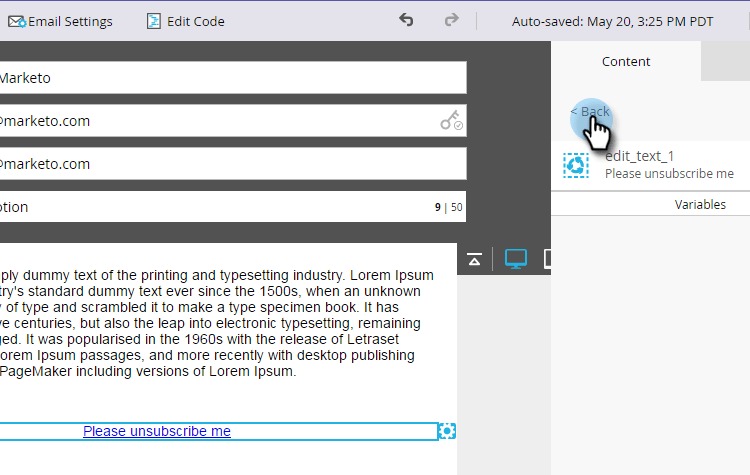 在电子邮件编辑器中,单击可编辑的元素。 然后单击齿轮图标并选择 Replace with Snippet。 如果要选择可编辑的代码片段元素,请单击齿轮图标并选择 Edit。