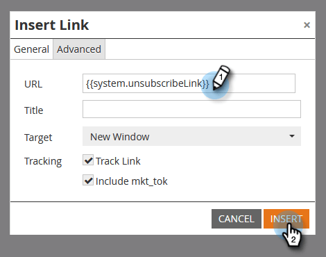{{system.unsubscribeLink}}复制并粘贴到 URL 字段中。 单击 Insert。