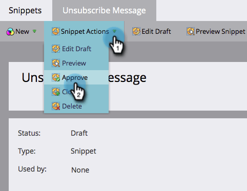 对所有区段重复执行上述操作。 然后,返回 Design Studio,单击 Snippet Actions 下拉列表,然后单击 Approve。
