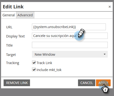 {{system.unsubscribeLink}}仍然在 URL 字段中。 编辑 Display Text 以匹配您选择的语言。 单击 Apply。