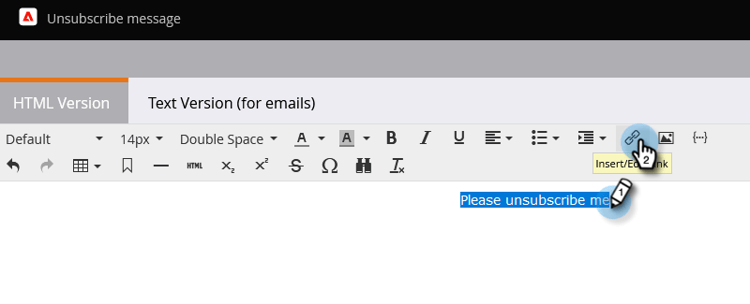 键入默认取消订阅消息,将其突出显示,然后单击超链接图标。