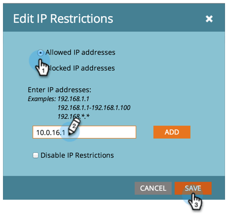 - Disable IP Restrictions:选中此项将停止任何/所有限制规则的工作。 将其用于测试目的。