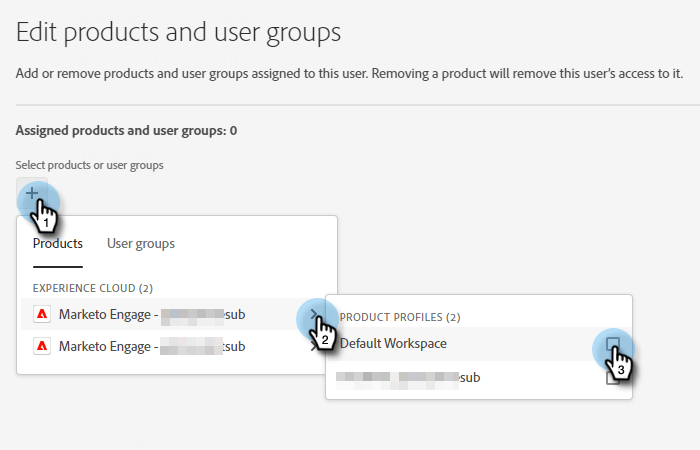 单击 + 符号。 单击所需的Marketo Engage订阅(如果有多个订阅)旁边的V形符号,然后选择所需的产品配置文件。