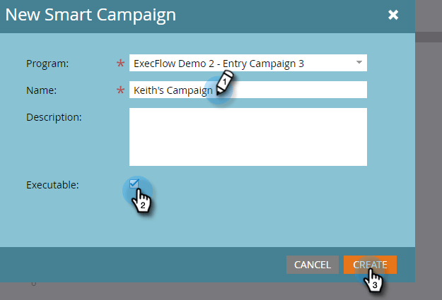 您还可以克隆现有的Smart Campaign。 如果克隆现有的可执行文件营销活动,则仍需在命名该营销活动后选中 Executable 复选框。
