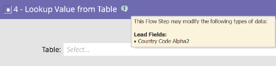 您可以将鼠标悬停在其工具提示图标上,以检查为给定流程步骤配置了哪些传入字段。 这用于确定当潜在客户流经它时哪些字段可能会发生更改,以便您可以使用这些字段在后续步骤中配置选项。