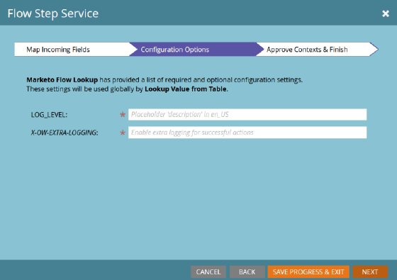 某些服务具有可选或必需的全局配置选项。 如果需要任何选项,则在保存或完成载入之前,必须为所有需要的选项设置一个值。 名称为斜体的参数将作为标头发送到调用的服务。