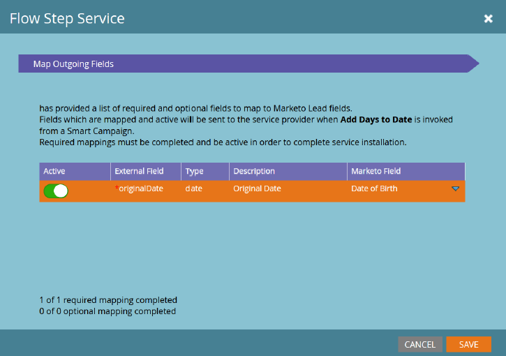 具有固定输入和输出集的服务(如事件注册流程步骤)使用服务驱动映射。 对于此类映射,服务提供商将以API名称的形式提供数据类型和提示。 如果提示与现有潜在客户字段的API名称匹配,则该字段将自动填充到映射部分中。 对于没有匹配提示的字段,您将需要从具有匹配数据类型的字段列表中手动填充映射。 必须填充所需的映射才能完成载入。