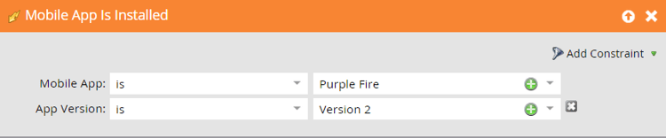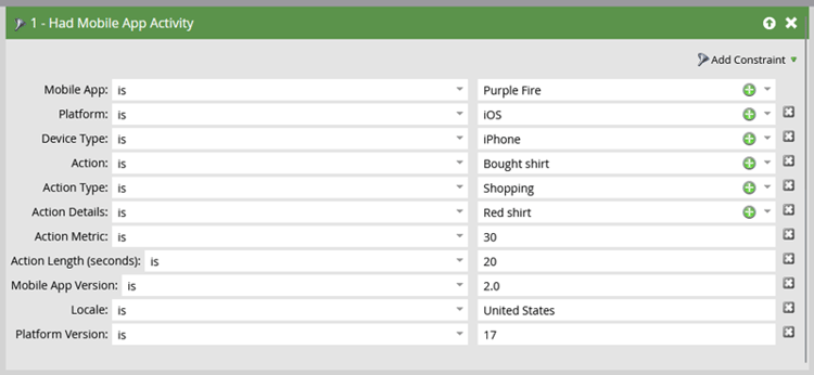 约束 — 设备类型、平台、移动应用程序版本、区域设置、平台版本以及五个其他限制: